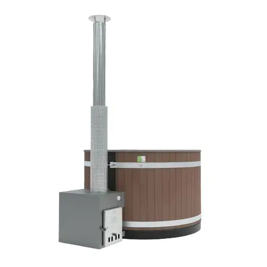 Som uppvärmare används en utvändig, grå Macu-kamin som passar medelstora badtunnor. Kaminen är tillverkad i högklassig, värmeledande marinaluminium.